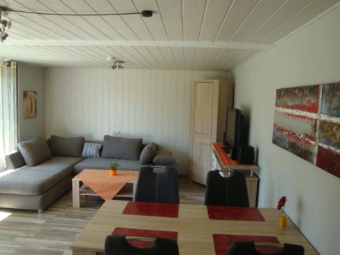 Gemütliches Wohnzimmer mit Essecke, Sat-TV, Musikanlage. Die Sitzgarnitur lässt sich zu einer Schlafcouch ausziehen.